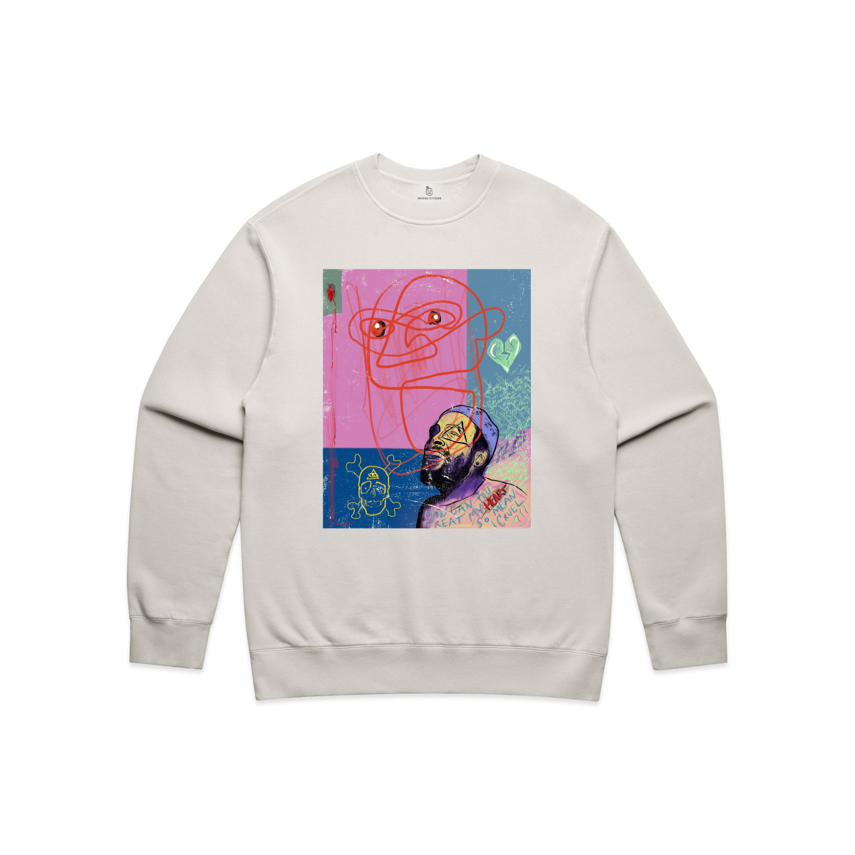 Jacinto, Cruel Heart art printed on our Ease, relaxed fit, premium, mid-heavyweight faded crewneck. Comfort, style, and finesse.